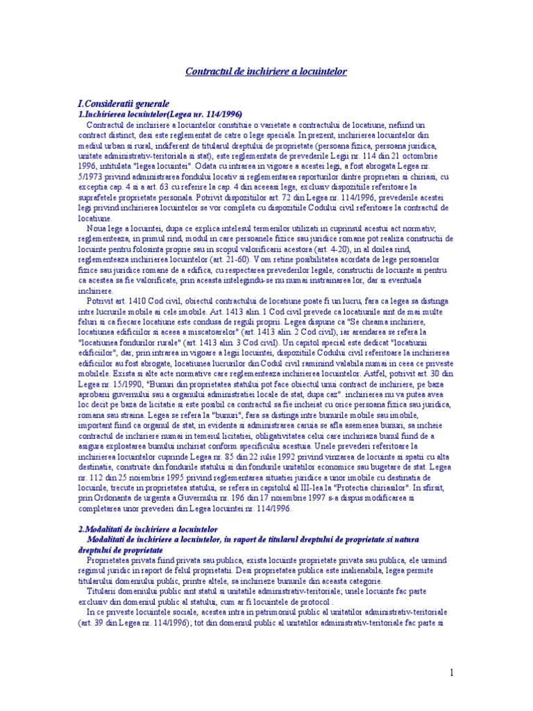 Download formular model de contract inchiriere imobil spatiu apartament model 3 in format pdf, word, doc,. 1824 din noul cod civil: In acest sens, si codul civil consacra dreptul proprietarului de a se bucura si dispune de un lucru in mod exclusiv si absolut, insa 'cu modificarile stabilite de legi' in sfarsit, noi masuri de prorogare legala (de prelungire sau de reinnoire) a contractelor de inchiriere au fost luate prin oug nr.40/1999.